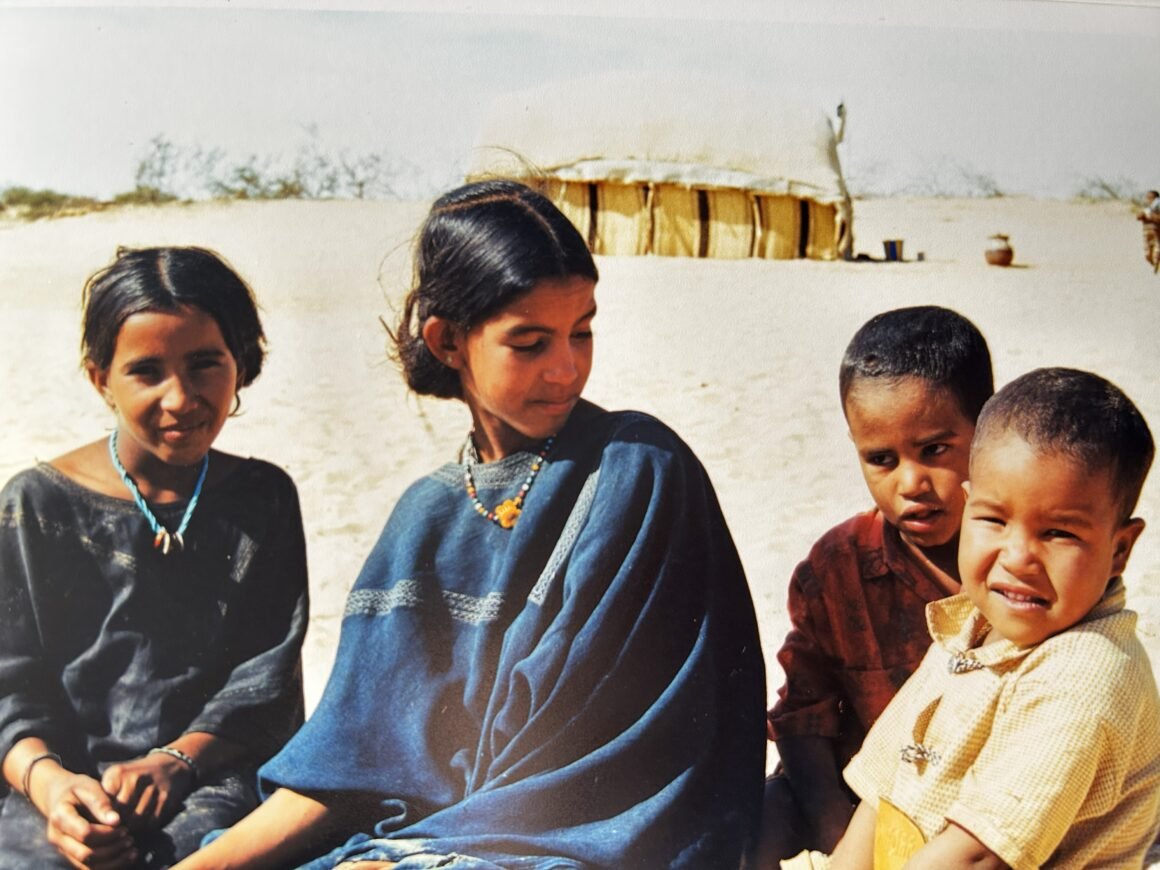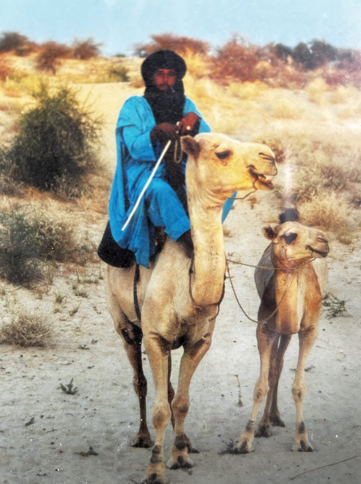 He was elegantly dressed in a turquoise blue cape, a skilfully wound black scarf framing his face. His features, furrowed like the desert dunes, had an opalescent quality. He rested his bare feet expertly in the dip of his camel’s neck. There would be no forgetting his name: Sandy.